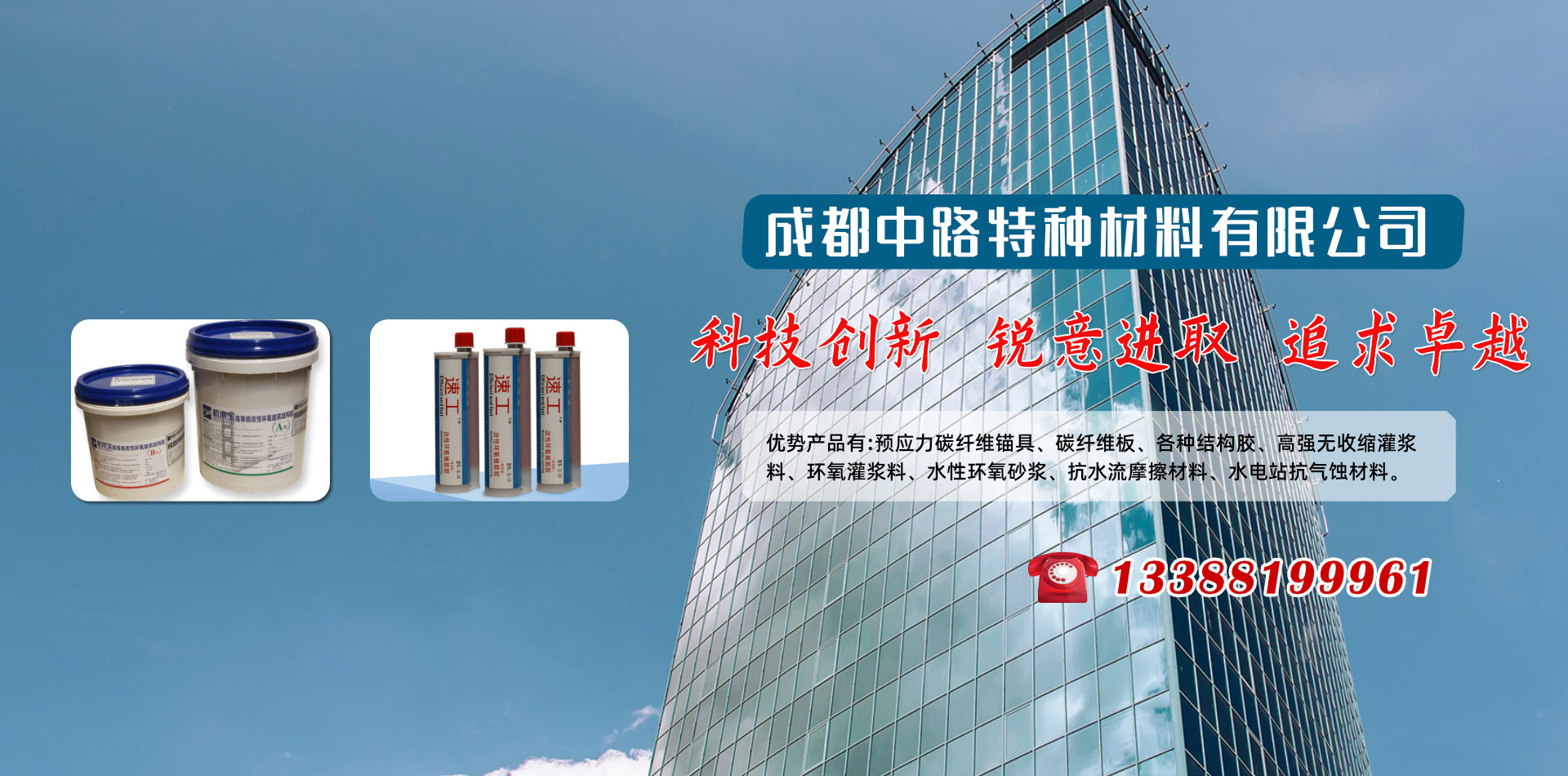 成都中路特種材料有限公司借助清華大學高分子材料學科、晨光化工研究院、西南交通大學、四川交通職業技術學院科研技術平臺成為一家集新材料研發、銷售、技術服務和施工于一體的專業服務公司,優勢產品有:預應力碳纖維錨具、碳纖維板、各種結構膠、高強無收縮灌漿料、環氧灌漿料、水性環氧砂漿、抗水流摩擦材料、水電站抗氣蝕材料和研發各種特殊用途膠黏劑產品地處西南腹地成都,業務覆蓋四川各大中小城市、重慶、云南、昆明、新疆、西藏等區域。產品涵蓋各種加固施工材料、施工設備及施工配件,品牌有威士邦等aa進口品牌,同時批發銷售國產高、中、低端品牌,為客戶提供全面參考。